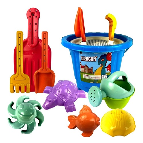 Contém balde com alça, pá grande, garfo, colher, tartaruga, sol, concha, peixe, peneira e regador.